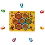Edukacyjna gra Pszczeli Plaster Montessori wspiera rozwój zdolności motorycznych i samodzielność dzieci. Zawiera podstawę z masywnego drewna i siedem kolorowych pszczółek, które dzieci umieszczają w odpowiadających im otworach za pomocą dołączonej czerwonej plastikowej pęsety.