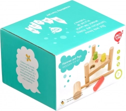 Po wbiciu wszystkich kołeczków można odwrócić podstawę i kontynuować, co zapewnia niekończącą się powtarzalną zabawę bez gubienia elementów. Naturalne drewno o gładkiej powierzchni gwarantuje trwałość i bezpieczeństwo podczas codziennego użytkowania.