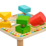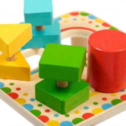 Plansza na stabilnych nóżkach ma cztery kolorowo obramowane otwory, które pasują do kolorów poszczególnych elementów. Zestaw idealnie sprawdzi się do samodzielnej zabawy i wspólnego odkrywania z rodzicami, a także świetnie nadaje się jako wysokiej jakości drewniana zabawka edukacyjna dla przedszkolaków.