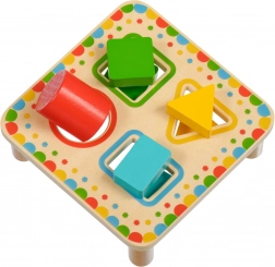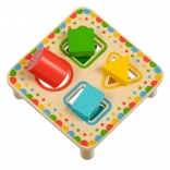 Cztery kolorowo obramowane otwory w planszy odpowiadają kolorom elementów. Dzieci łatwo przyswajają kolory i podstawowe figury geometryczne.