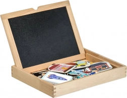 Pokrywa służy jako magnetyczna biała i czarna tablica. Dzięki dołączonemu markerowi, kredom i gąbce dzieci rysują, zapisują i łatwo wszystko ścierają.