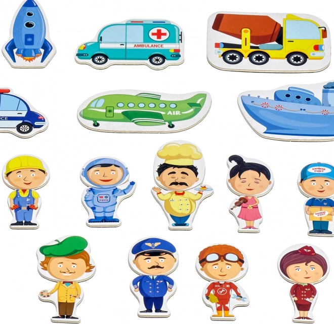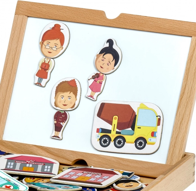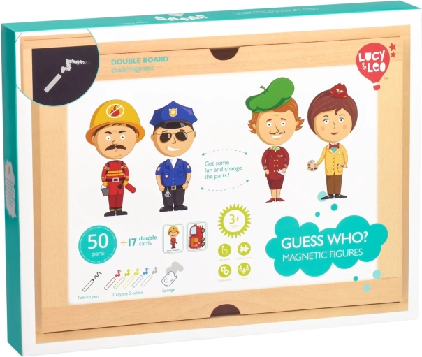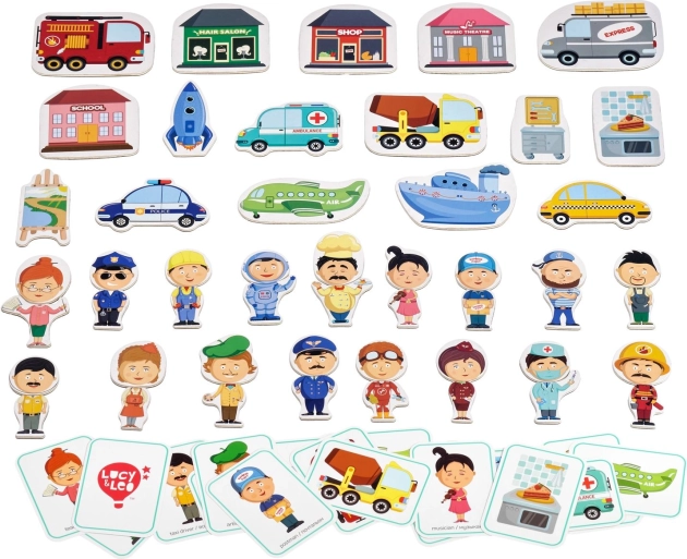 Ten kreatywny magnetyczny zestaw w przystępny, zabawowy sposób przybliża dzieciom świat zawodów – od strażaka i policjanta po kucharza czy pilota. Dzięki dwustronnym kartom dzieci mogą układać prawidłowe kombinacje lub tworzyć własne postacie i scenki. Praktyczna drewniana walizeczka z magnetyczną tablicą zapewnia wygodne przechowywanie wszystkich elementów oraz łatwe przenoszenie w podróży.