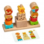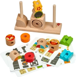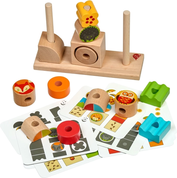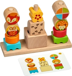 Zestaw zawiera solidną drewnianą podstawę, zróżnicowane klocki o różnych rozmiarach oraz 14 dwustronnych kart z wyzwaniami. Na klockach ze zwierzętami znajdują się motywy w wersji „dzień” i „noc”, co dodaje zabawie wymiaru fabularnego. Po zabawie wszystko łatwo schować do lnianego woreczka.
