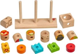 Stabilna baza i trzy kołki ułatwiają prawidłowe układanie elementów. Dzieci trenują małą motorykę i koordynację ręka–oko podczas nawlekania i układania.