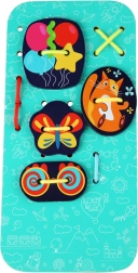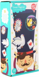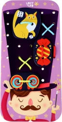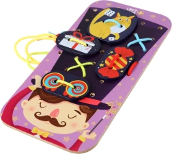 Ten zabawny zestaw do sznurowania i przewlekania z motywem magika zaprasza dzieci do świata fantazji. Na dużej podkładce z głową magika i jego kapeluszem mogą za pomocą sznurówek mocować kolorowe dodatki – od króliczka i monet po tajemnicze karty. Podczas zabawy dzieci ćwiczą koordynację ręka–oko, cierpliwość i twórczość.