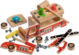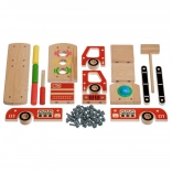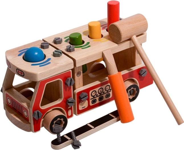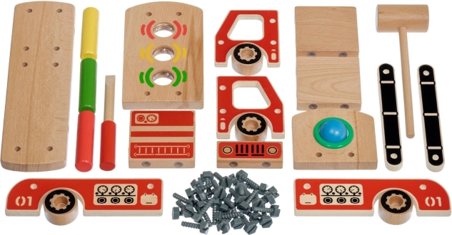 Złóż działający drewniany wóz strażacki ze śrubami i narzędziami. Proces budowy wspiera logiczne myślenie i cierpliwość.