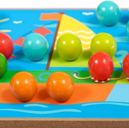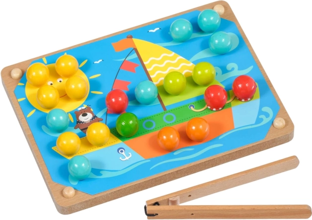 Drewniana podstawa z otworami, kolorowe kołeczki i pęseta motywują dzieci do precyzyjnego chwytu oraz ćwiczą małą motorykę i koordynację oko–ręka.