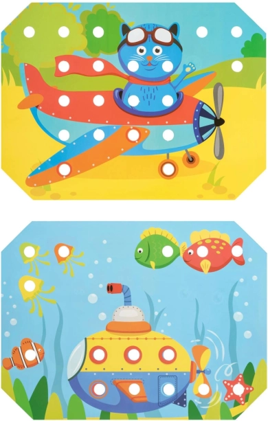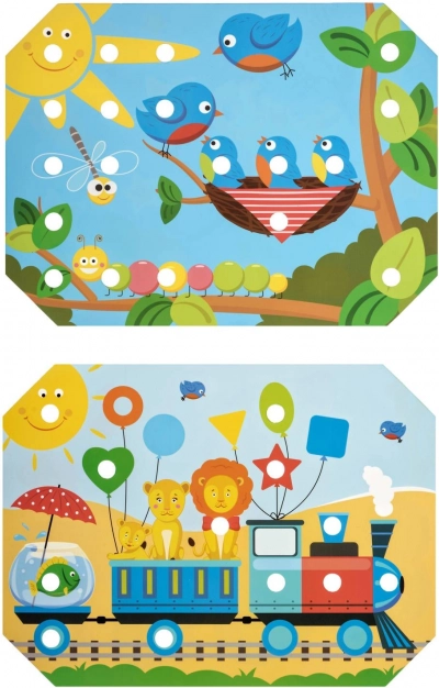 Dzieci wybierają jeden z kolorowych szablonów, układają go na drewnianej podstawie i wypełniają obrazek kołeczkami za pomocą pęsety lub dłoni. Mogą też ćwiczyć sznurowanie i wyszywanie z użyciem dołączonych sznurówek. Zabawa naturalnie wspiera koncentrację, logikę, cierpliwość i precyzję.