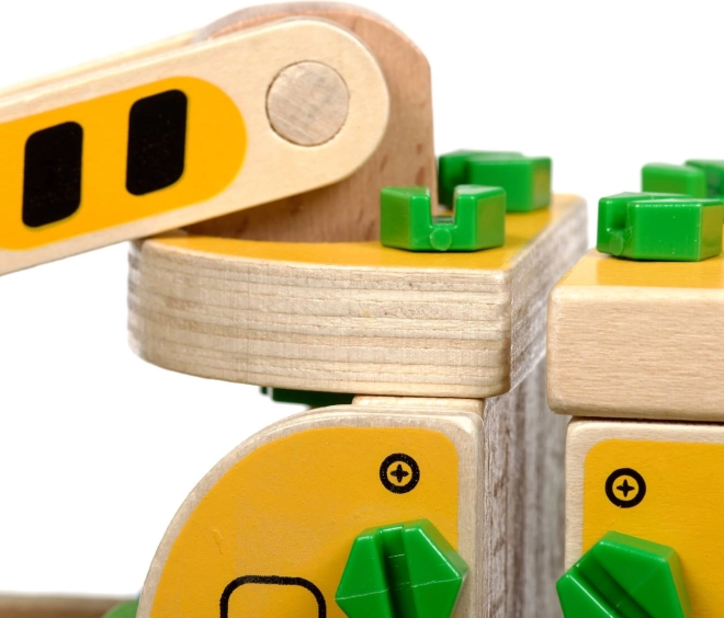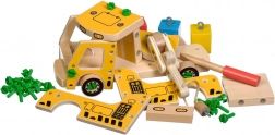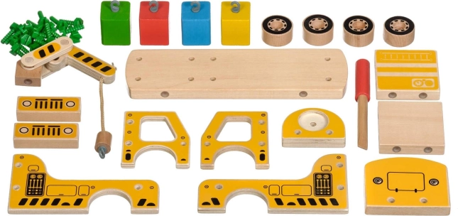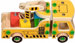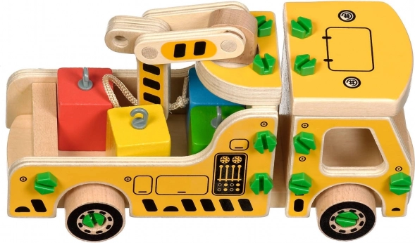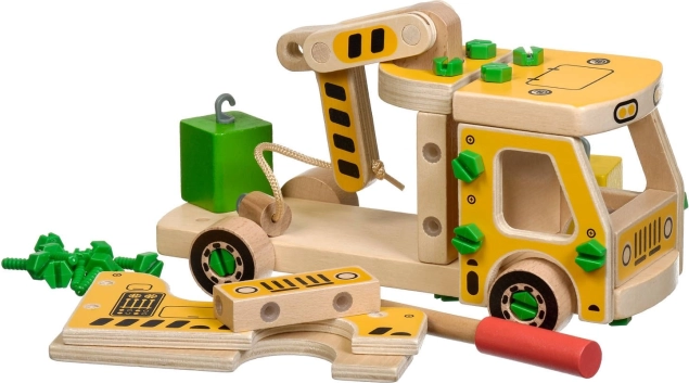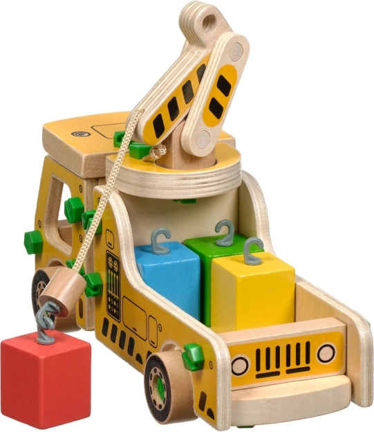 Opakowanie zawiera 16 drewnianych elementów do złożenia dźwigu, śruby, śrubokręt oraz 4 kolorowe klocki przedstawiające ładunek. Zabawka pełni również funkcję pomocy Montessori, która pomaga dziecku skutecznie rozwijać różnorodne umiejętności.