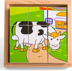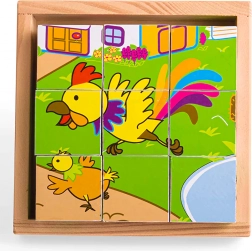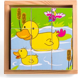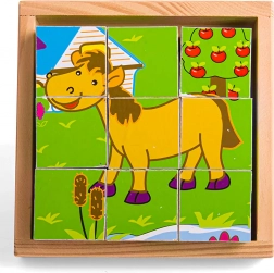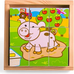 Dziewięć solidnych drewnianych klocków składa się łącznie na sześć uroczych obrazków zwierzątek. Dzieci mogą obracać, łączyć i tworzyć, co naturalnie wspiera motorykę małą, zwinność oraz koncentrację. Zestaw zawiera drewnianą podkładkę ułatwiającą układanie i bezpieczne przechowywanie – idealne w domu i w podróży.