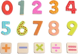Zestaw zawiera barwne drewniane cyfry i podstawowe znaki matematyczne. Dzieci łatwo układają proste działania i uczą się liczyć.