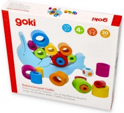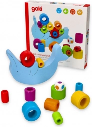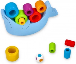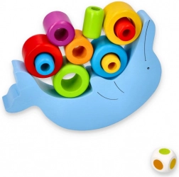 Zestaw zawiera delfina wykonanego z wysokiej jakości drewna oraz 18 kolorowych krążków, które trzeba strategicznie ułożyć. Dołączona kostka do gry dodaje grze dodatkowy poziom trudności i zabawy, określając kolejność, w jakiej krążki są układane.