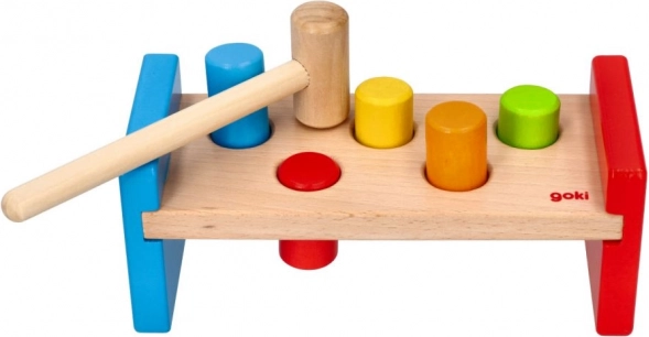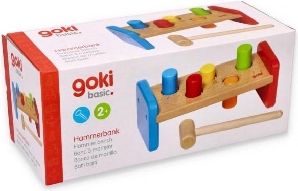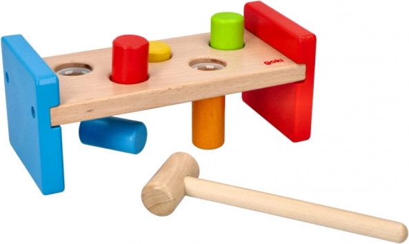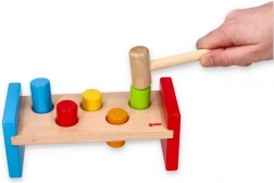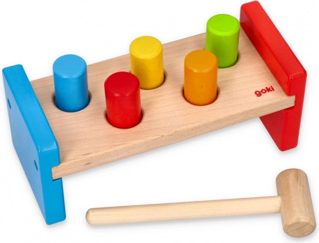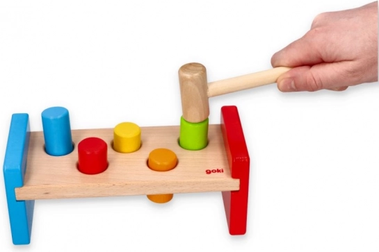 Ta solidna ławeczka do wbijania wykonana jest z wytrzymałego, gładko wykończonego drewna z bezpiecznymi, nietoksycznymi farbami. Dzieci mogą dzięki drewnianemu młotkowi ćwiczyć chwyt, siłę uderzenia i cierpliwość, a kolorowe kołki zachęcają do powtarzalnej zabawy.