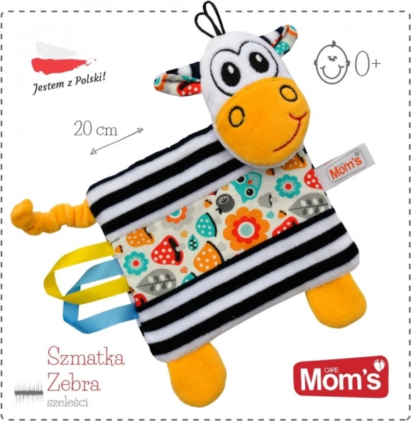 Ta mięciutka pluszowa zebra z metkami to perfekcyjny towarzysz do łóżeczka, wózka i w podróży. Łączy przyjemny w dotyku materiał z praktycznymi detalami wspierającymi sensoryczne odkrywanie i wyciszenie dziecka. Wyprodukowano w Polsce z naciskiem na jakość i bezpieczeństwo, z ważną deklaracją zgodności CE.