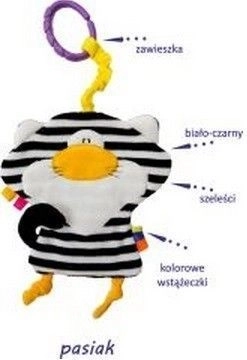 Urocza pluszowa zabawka z praktyczną pętelką do zawieszenia ucieszy każde niemowlę od urodzenia. Kontrastowe czarno-białe paski, miękkie materiały i bezpieczne wykonanie wspierają rozwój sensoryczny, koją i zajmują malucha w podróży i w domu. Łatwa pielęgnacja oraz kompaktowe wymiary czynią ją idealnym towarzyszem do wózka, fotelika samochodowego i łóżeczka.