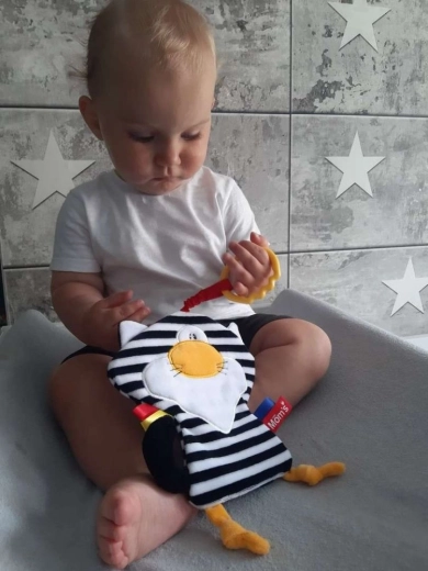 Wyraziste czarno-białe pasy i żółte akcenty przyciągają uwagę niemowlęcia, wspierają rozwój wzroku i koncentrację od pierwszych dni.