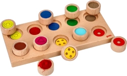 Odkryj sensoryczną zabawę z drewnianą grą GOKI, która rozwija małą motorykę, percepcję dotykową oraz rozpoznawanie faktur i kolorów. Dzieci za pomocą dotyku szukają właściwego otworu dla każdego walca o innej teksturze – bez podglądania, w sposób zabawny i bezpieczny.