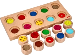 Podstawowa plansza z naturalnego drewna z okrągłymi wycięciami oraz solidnymi pionkami została stworzona do codziennej zabawy w domu i przedszkolu.