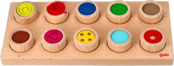 Każdy z 10 drewnianych walców ma inny powierzchniowy wzór. Dzieci trenują dotyk i porównywanie, gdy na ślepo szukają właściwego otworu w planszy.