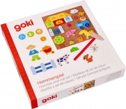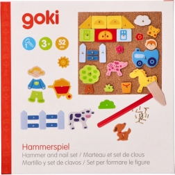 Ta oryginalna Goki Gra z Młotkiem przynosi godziny zabawy i tworzenia dla dzieci. Zestaw zawiera łącznie 52 elementy - drewniane kształty, gwoździki, korkową podstawkę i młotek, co pozwala na tworzenie różnych obrazków ze zwierzętami, farmą i innymi motywami.