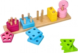 Zabawna drewniana układanka łączy sortowanie kolorów i kształtów z nakładaniem elementów na kołki o różnej liczbie otworów. Rozwija małą motorykę, koordynację ręka–oko oraz myślenie logiczne, wykonana z litego drewna dla bezpiecznej i trwałej zabawy.