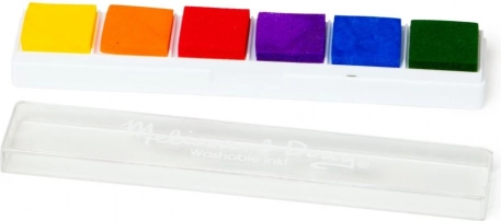 Praktyczny organizer z poduszkami tuszującymi w kolorach żółtym, pomarańczowym, czerwonym, fioletowym, niebieskim i zielonym. Zmywalne tusze dla łatwego sprzątania i czystych odbitek.