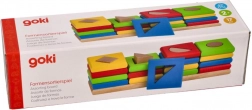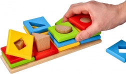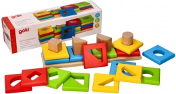 Ta wysokiej jakości drewniana układanka marki GOKI łączy naukę z zabawą. Cztery słupki z kolorowymi kwadratowymi elementami i różnymi otworami (koło, trójkąt, kwadrat itp.) uczą dzieci rozpoznawania kształtów i kolorów, jednocześnie rozwijając koordynację oko–ręka i precyzję ruchów.