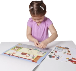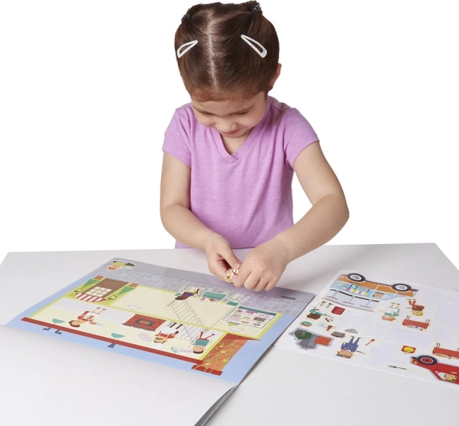 Każdy zestaw zawiera wielokrotnie używane naklejki, które można łatwo przemieszczać i naklejać ponownie, co pozwala dzieciom na tworzenie nieskończonych wariacji scen.