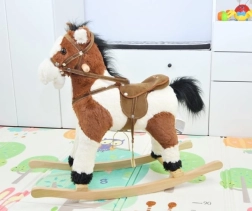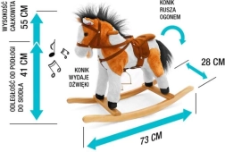 Ten magiczny koń na biegunach jest wykonany z miękkiego i wysokiej jakości pluszu, co gwarantuje przyjemny w dotyku. Wyjątkową cechą są drewniane listwy biegunowe i solidne drewniane uchwyty, które zapewniają stabilność i bezpieczeństwo podczas zabawy. Konik jest wyposażony w siodło ze strzemionami i uzda, co jeszcze bardziej przybliża autentyczność jazdy konnej.