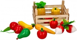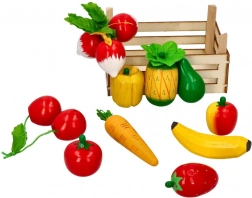 Drewniana skrzynka pełna owoców i warzyw dla małych kucharzy i sprzedawców, idealna pomoc do zabawy w sklep lub na targ.