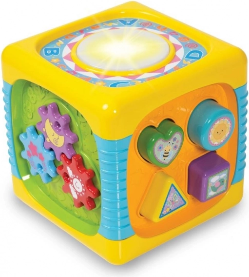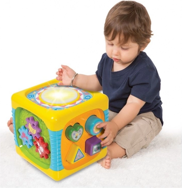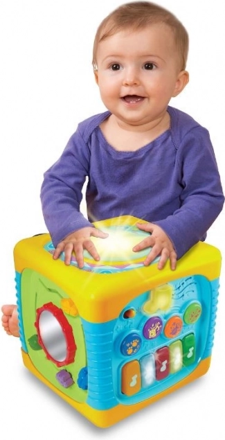 Każda ścianka kostki oferuje maluchowi wiele atrakcji i niespodzianek, które na długo przyciągną jego uwagę. Zabawka stymuluje wszystkie zmysły dziecka i wspiera jego rozwój. Intensywne, żywe kolory, przyjemne delikatne dźwięki oraz latające elementy zachęcają dziecko do zabawy. Ta kostka to centrum świetnej rozrywki na długi czas.