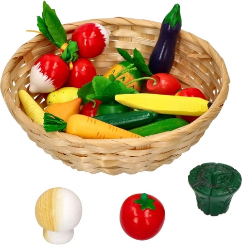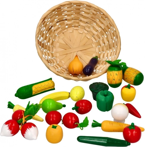 Drewniane owoce i warzywa w koszyku – 21 elementów