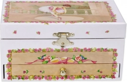 Elegancka pozytywka–szkatułka na biżuterię z szufladką i uroczą baletką zachwyci każdą małą elegantkę. Po otwarciu rozbrzmiewa melodia Jezioro łabędzie, a baletnica zaczyna się obracać przed lusterkiem. Szkatułka oferuje praktyczną przestrzeń do przechowywania drobiazgów i biżuterii, a także stanowi piękny dekoracyjny dodatek do dziecięcego pokoju.