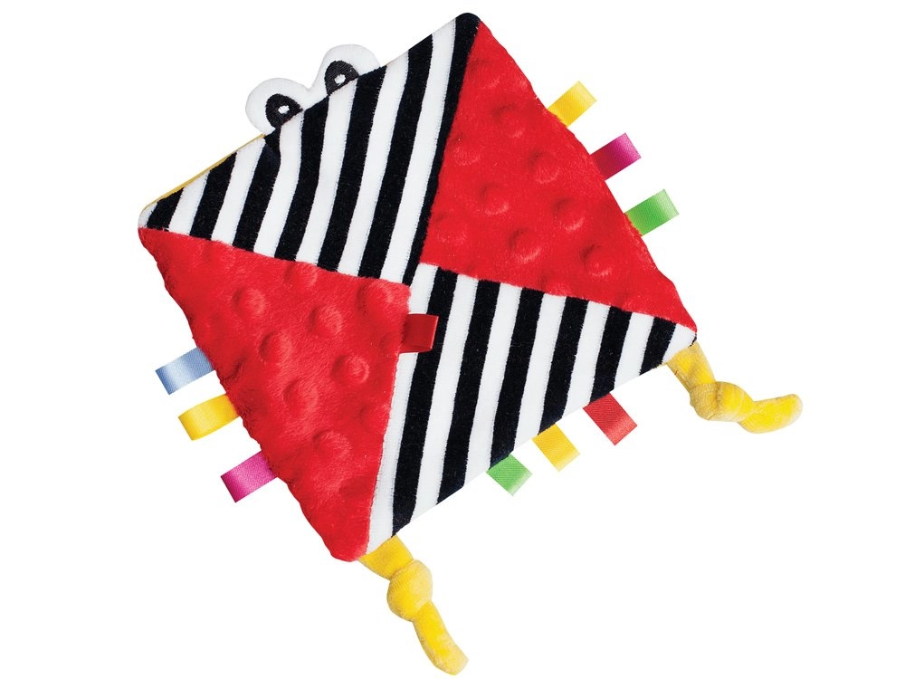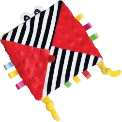 Kolorowe wstążki na brzegach oraz supełki w rogach zachęcają do chwytania i ugniatania. Idealny rozmiar 15 × 15 cm pasuje do małej rączki.