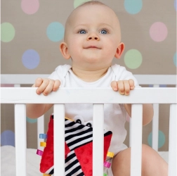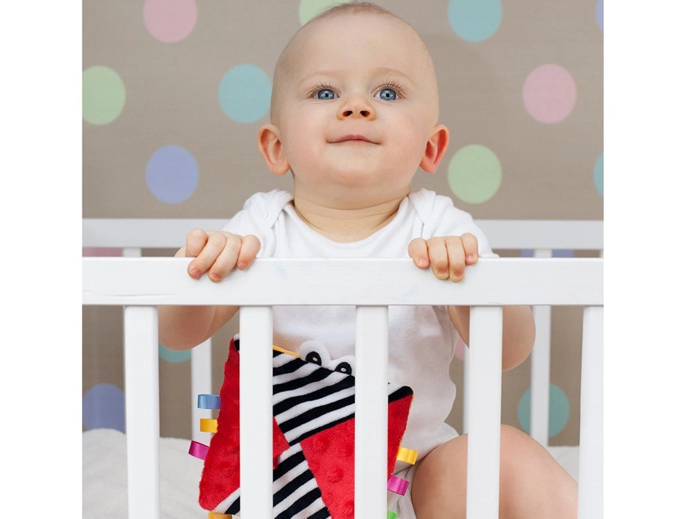 Połączenie minky z wypustkami, gładkiej satynowej tkaniny i kontrastowych pasów rozwija zmysł dotyku i wzroku. Idealne do ćwiczenia małej motoryki i chwytu.