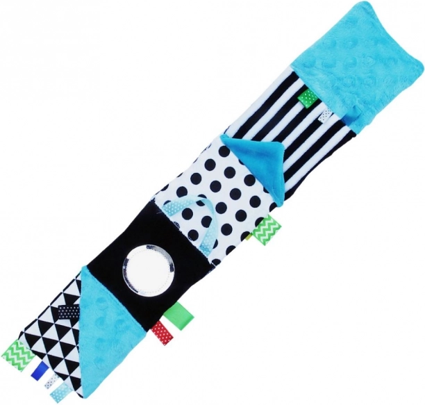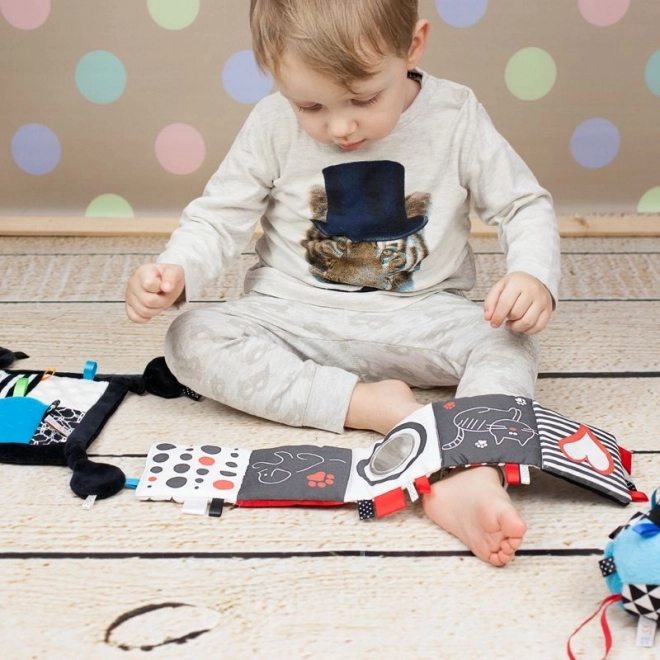 Ta miękka materiałowa książeczka została zaprojektowana specjalnie dla noworodków i niemowląt. Kontrastowe wzory przyciągają uwagę dziecka i wspierają rozwój wzroku, a zróżnicowane faktury i szeleszczące elementy pobudzają zmysł dotyku i ciekawskie paluszki. Zintegrowane bezpieczne lusterko pomaga dziecku odkrywać własne odbicie i uczy kontaktu z samym sobą.