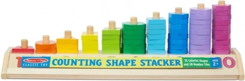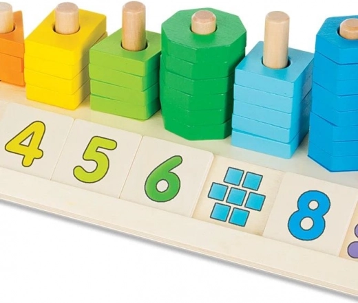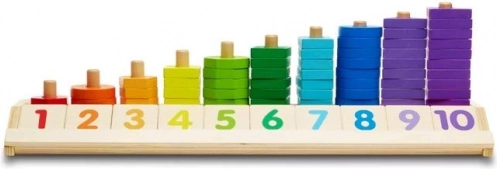 Ta drewniana zabawka edukacyjna łączy liczenie, rozpoznawanie kolorów i kształtów w jedną angażującą całość. Na drewnianej podstawie znajduje się 10 kołków z ponumerowanymi pozycjami, do których dzieci dopasowują odpowiednią liczbę krążków. Każda cyfra na zdejmowanym kwadraciku ma kolor odpowiadający barwie krążków, co znacząco ułatwia naukę.