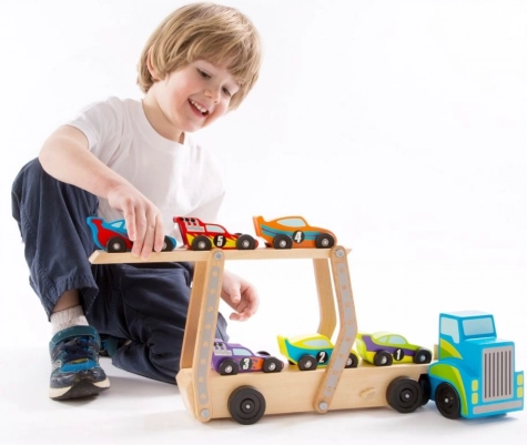 Ta drewniana laweta do aut oferuje świetną okazję do zabawnej i edukacyjnej gry. Dzieci mogą łatwo ładować i rozładowywać pojazdy dzięki odczepianej górnej platformie, co wspiera wyobraźnię i koordynację. Zabawka wykonana jest z wysokiej jakości drewna, co gwarantuje długą trwałość i zapewnia przyjemne doznania dotykowe.