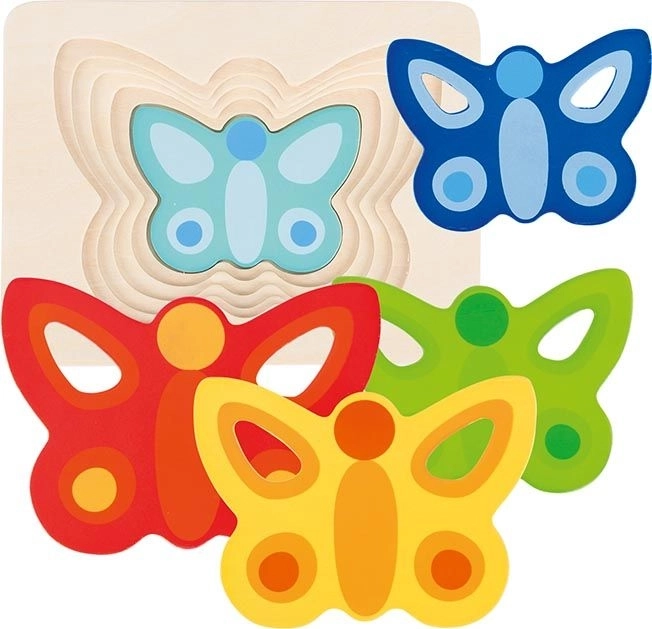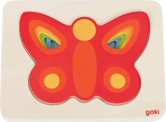 Odkryj zabawną, wielowarstwową układankę z motywem kolorowych motyli od marki GOKI. Dzieci podczas układania mają mnóstwo frajdy, a jednocześnie rozwijają małą motorykę, rozpoznawanie kolorów oraz logiczne myślenie. Elementów jest pięć, a do każdej warstwy pasuje tylko jeden motyl, co wspiera cierpliwość i ciągłe uczenie się.