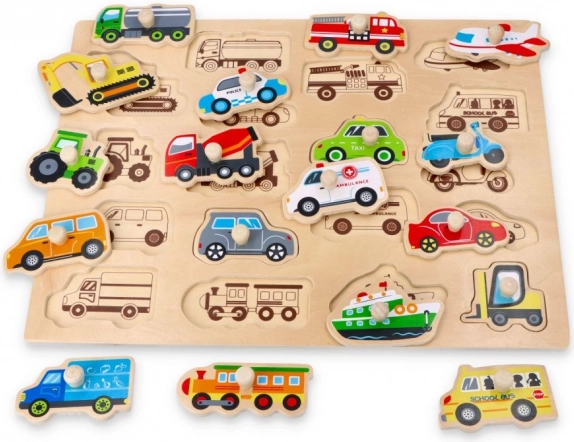 Ta wysokiej jakości układanka z naturalnego drewna oferuje dzieciom bezpieczną i wciągającą zabawę. Każdy element przedstawia inny pojazd i ma praktyczne drewniane guzikowe uchwyty ułatwiające chwytanie małymi rączkami. Na podstawie znajdują się nadrukowane kontury, które pomagają dzieciom prawidłowo umieszczać elementy oraz uczą rozpoznawania kształtów i kolorów.
