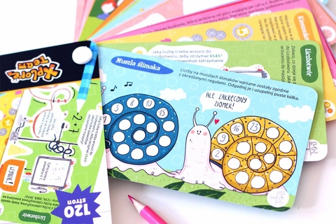Książka „Xplore Team: Zabawna zawiła matematyka” została zaprojektowana tak, aby uczyć dzieci podstaw matematyki w sposób zabawny i interaktywny. Dzięki kompaktowemu formatowi oraz praktycznemu połączeniu plastikową śrubą można ją łatwo zabrać wszędzie ze sobą.