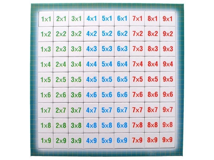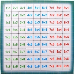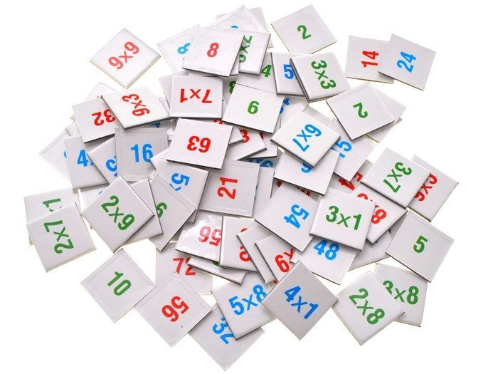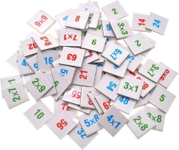 Małe kwadratowe kartoniki z przykładami i liczbami w różnych kolorach poprawiają orientację i wspierają szybkie wyszukiwanie prawidłowych wyników.