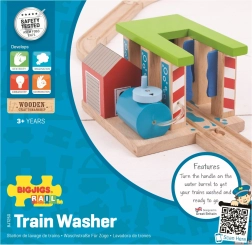 Produkt wykonany z wysokiej jakości, odpowiedzialnie pozyskiwanych materiałów naturalnych i spełnia aktualne europejskie normy bezpieczeństwa. Dzięki uniwersalnym wymiarom myjnia jest kompatybilna z większością drewnianych torów i pociągów na rynku. Pociąg nie jest częścią zestawu, co ułatwia połączenie z już posiadanymi kompletami.