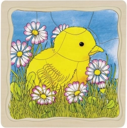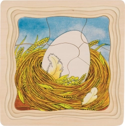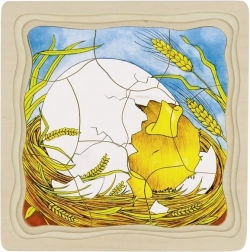 To wyjątkowe drewniane puzzle podzielono na cztery warstwy obrazków, z których każda przedstawia jeden etap rozwoju kury. Każda warstwa ma inny projekt i różną liczbę elementów, co zapewnia urozmaicenie i pobudza dziecięcą wyobraźnię. Puzzle umieszczono w solidnej planszy z frezowanymi krawędziami, która służy jako stabilna podkładka do układania.