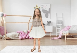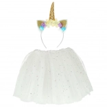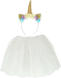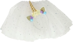 Urokliwy kostium jednorożca daje dzieciom mnóstwo radości i przestrzeni dla wyobraźni. Lekka tutu spódniczka z gwiazdkami pięknie faluje w ruchu, a opaska ze złotym rogiem i kwiatami dodaje całej stylizacji magicznego charakteru.