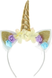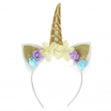 Wygodna opaska z lśniącym rogiem, błyszczącymi uszkami i kolorowymi kwiatami pięknie dopełni kostium jednorożca.