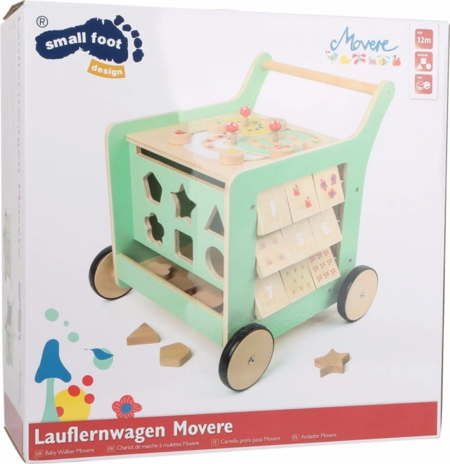 Ten drewniany wózek pomaga w rozwoju motoryki małej dzięki funkcji pchania oraz integracji aktywności zabawowych.
