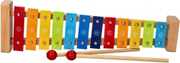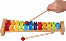 Wytrzymała drewniana rama i 12 metalowych klawiszy zapewniają przyjemne brzmienie oraz długą żywotność zabawki.