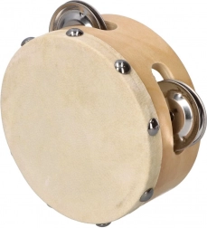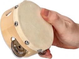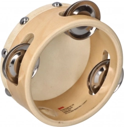Tamburyna ma tradycyjny wygląd z naturalnym drewnianym korpusem i solidnie przymocowanymi metalowymi talerzykami.