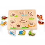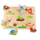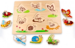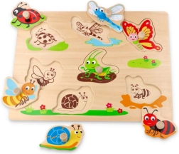 Ta drewniana układanka z uchwytami z motywem owadów to idealna pomoc dydaktyczna do pierwszego odkrywania kształtów. Dzięki wygodnym uchwytom–guzikom dzieci łatwo uczą się manipulować elementami, rozwijając małą motorykę i koordynację ręka–oko.